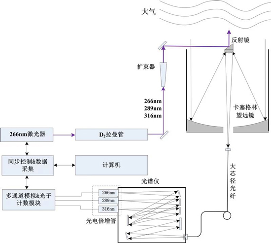 臭氧雷達系應用差分吸收原理,通過高能Nd:YAG激光器發(fā)射266nm的紫外脈沖激光,其中一束位于臭氧氣體的吸收線上,另一束位于吸收線之外,組成一對探測波長。266nm激光通過拉曼管后產(chǎn)生289nm、299nm和316nm三個波長激光,266nm和289nm、289nm和299nm、299nm和316nm一共組成3個波長對,分別對應不同的探測高度和探測時間(白天或夜晚)。每一個波長對的其中一個波長位于臭氧吸收較強的位置,而另一個波長位于臭氧吸收很弱或物吸收的位置,利用臭氧對這兩個激光波長的吸收差別(兩種波長光信號的消光比),確定兩個脈沖激光共同路徑上臭氧的濃度,從而實現(xiàn)對臭氧時空分布的探測。