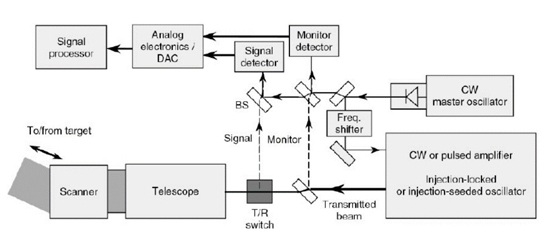 主要原理:單頻窄線寬1550nm激光,通過分束器后分成二束光,一束作為本振光,用于和接收到的回波激光進行光混頻;另外一束通過聲光頻移調(diào)制后,形成頻移的脈沖信號光,經(jīng)過脈沖激光放大器后,產(chǎn)生高能量的脈沖激光通過光學系統(tǒng)發(fā)射到空中。光信號探測模塊接收回波激光與種子光分束的本振光,通過混頻效應,轉(zhuǎn)換成電信號,電信號經(jīng)過放大、濾波后送往后續(xù)信號處理單元,再經(jīng)過軟件反演算法處理,*終可得到風向、風速等信息、圖像或風場結(jié)構(gòu)。