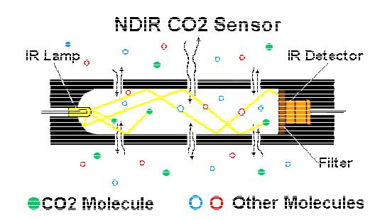 氣體分子擴(kuò)散進(jìn)氣室,紅外光直接照射進(jìn)氣室,照到探測(cè)器上。探測(cè)器上有4.26um濾光片,這個(gè)波長是CO2的特性吸收峰,所以只有CO2分子是會(huì)影響到探測(cè)器的光強(qiáng),我們可以通過探測(cè)光強(qiáng)的變化值得出CO2的濃度。到達(dá)探測(cè)器的光強(qiáng)和CO2濃度成反比關(guān)系,高濃度的CO2比低濃度的吸收更多的紅外光。