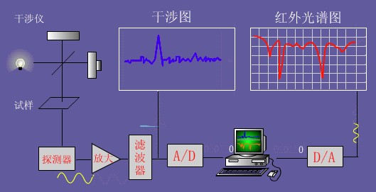 工作原理:光源發(fā)出的紅外輻射,經(jīng)干涉儀轉(zhuǎn)變成干涉圖,通過試樣后得到含試樣信息的干涉圖,由電子計(jì)算機(jī)采集,并經(jīng)過快速傅立葉變換,得到吸收強(qiáng)度或透光度隨頻率或波數(shù)變化的紅外光譜圖。干涉圖從數(shù)學(xué)觀點(diǎn)講,就是傅立葉變換,計(jì)算機(jī)的任務(wù)是進(jìn)行傅立葉逆變換。