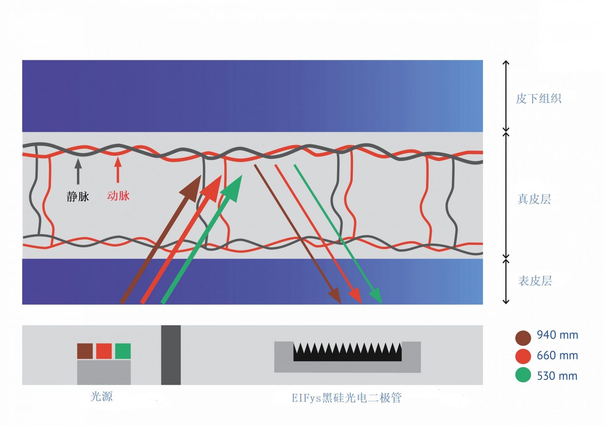 利用光電容積描記(PPG)是使用光電傳感器測量心率和血氧含量水平的基本方法,535nm綠光用于測量心率,皮膚中的血液量隨著心臟跳動周期而變化,因此綠光的吸收和皮膚對綠光的反射也會隨著周期變化,綠光的光信號變化頻率就是心率。同樣的,光的吸收也會根據血液中與血紅蛋白結合的氧氣水平而變化,由于660nm紅光和940nm紅外光對氧含量更敏感,因此660nm紅光和940nm紅外光的反射信號主要用來計算氧含量。