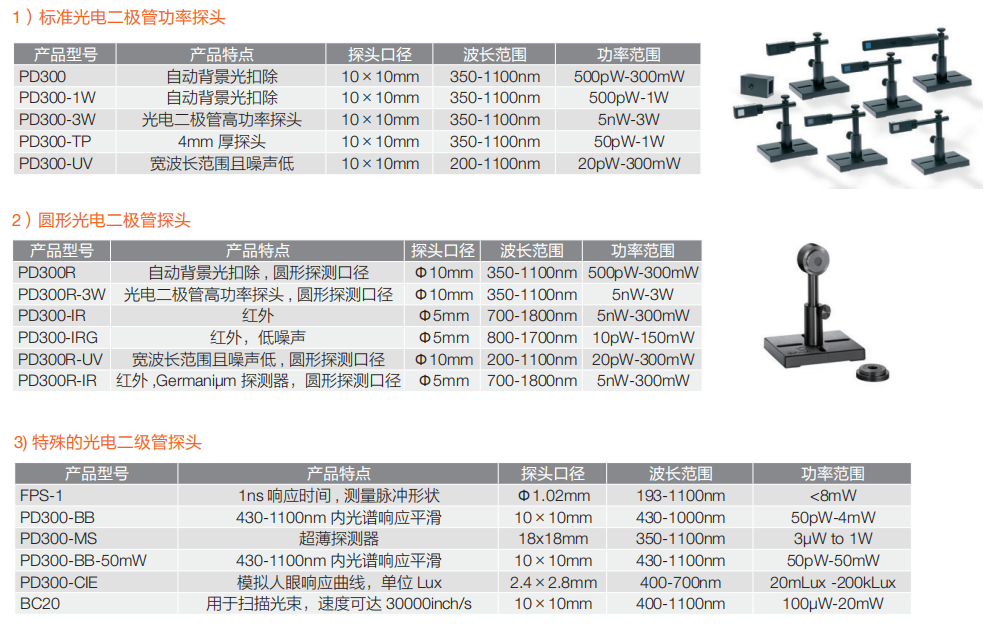 光電二極管探頭具備較高靈敏度,可以測量弱小的激光功率;且體積輕便小巧,響應速度快。光電二極管響應波長有確定范圍,而且光譜響應起伏較大,因此需要針對多個波長進行校準。特定設計的一些型號可測量寬光譜光源的功率,例如結合人眼響應的光度測量、寬光譜的LED/ UVLED 測量等。