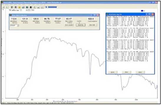 系統(tǒng)自帶的SpectraWiz®光譜學(xué)軟件內(nèi)置專用于太陽(yáng)光譜測(cè)試的應(yīng)用程序,可用于表征太陽(yáng)模擬器的參數(shù)。Solar Match用于監(jiān)視計(jì)算光譜輻照度:400-500nm,500-600nm,600-700nm,700-800nm,800-900nm,900-1000nm,1000-1100nm,可將每個(gè)范圍依據(jù)IEC/JIS/ASTM的理想百分比符合情況出具比較結(jié)果。這個(gè)測(cè)量的結(jié)果常用于太陽(yáng)模擬器燈A-D的分類。SpecTracWiz軟件還內(nèi)置了用于UV監(jiān)測(cè)、PAR計(jì)算等更多功能的應(yīng)用程序。以及將全光譜保存到文件或數(shù)據(jù)日志、時(shí)間序列分析的功能。