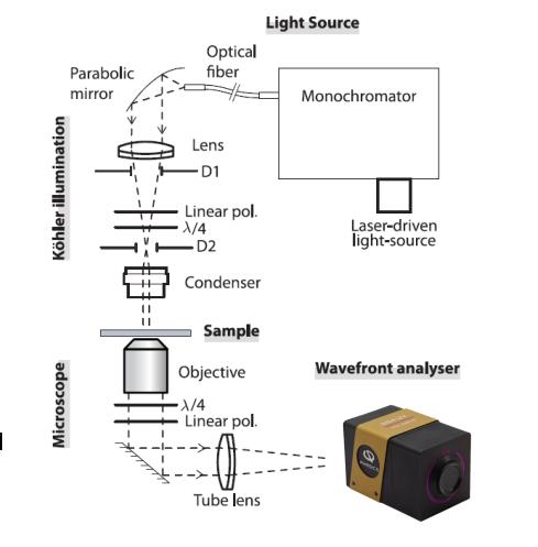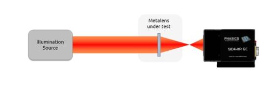 通常,在檢測(cè)超表面或者超透鏡時(shí),我們會(huì)使用上圖的架構(gòu),構(gòu)成顯微成像方案。該方案里,光源照明部分由激光驅(qū)動(dòng)白光光源(通常建議選用由我司代理的Energetiq Technologies公司的EQ-99X系列產(chǎn)品加單色儀),當(dāng)然也可以選用非相干光源。顯微物鏡的倍數(shù)和焦距可根據(jù)待測(cè)樣品靈活選定,波前的表征由法國(guó)Phasics公司的波前傳感器SID4系列產(chǎn)品完成。該產(chǎn)品可以覆蓋從紫外到中遠(yuǎn)紅外波段的測(cè)試要求。SID4系列波前傳感器可以直接和業(yè)內(nèi)標(biāo)準(zhǔn)顯微鏡對(duì)接,無(wú)需中轉(zhuǎn)器件。測(cè)量時(shí),通過(guò)樣品的光在SID4系列波前傳感器上被顯微鏡成像,再通過(guò)軟件分析干涉圖像,即可得出波前相位畸變。每次測(cè)量時(shí)都需要在拍攝待測(cè)物體的圖像之前,獲取參考圖像,然后從目標(biāo)圖像中減去參考圖像以補(bǔ)償入射光束的本身缺陷引入的誤差。