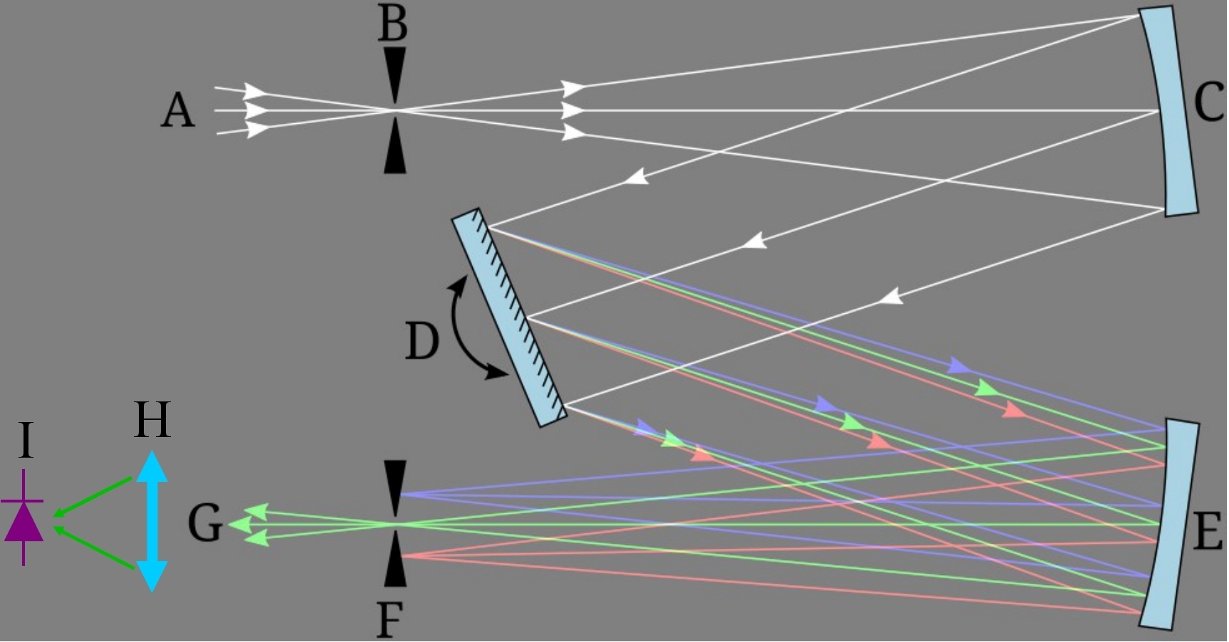 E為匯聚鏡,F為出射光學狹縫,G為出射光,H為匯聚鏡,I為探測器。