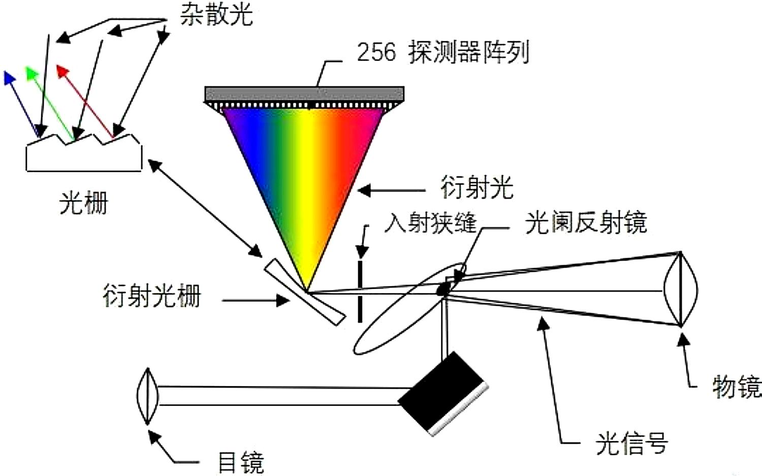 入射狹縫決定了進入單色器的光的多少。狹縫越小,分辨率越高,但整體靈敏度越低。衍射級次過濾器用于減少光柵衍射的高級衍射光。準直器將光線準直到光柵或棱鏡。無論是使用光柵分光,還是用棱鏡分光,儀器測得的光源數據都是一致的。光柵或棱鏡用于入射光的色散。匯聚光學元件將光線匯聚到探測器(光電倍增管、CMOS傳感器或CCD陣列)上。控制和日志系統用于定義和存儲數據。
