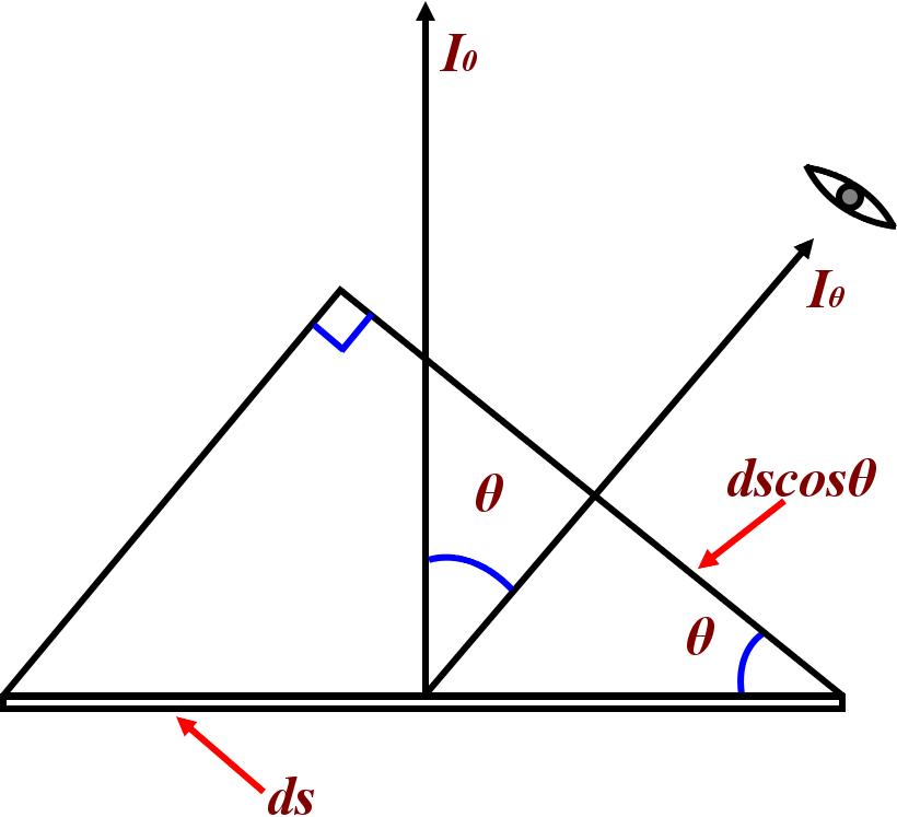 式中,Lθ為θ方向上測量的亮度值,單位cd/m2。可見,任意方向的Lθ=I0/ds為一定值,故人眼在任意方向觀看朗伯光源時,所感知的亮度是相同的,即所謂朗伯光源是各向同性光源。