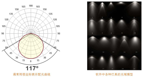 如上圖在模擬軟件中導入IES文件,很容易得到燈具的模型,對照明設計帶來很大的方便