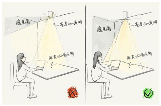 圖中左邊燈光直接照射人眼,會使人眼感覺不適;右側燈光照射到工作區,光線反射到人眼,工作區可見度高,人眼也舒適。