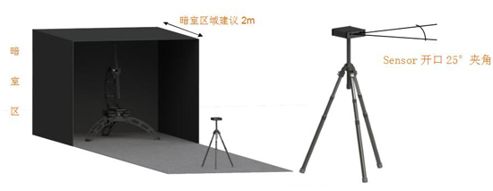 通常在進行光測量時,需要一個完全黑暗的房間。 但是對于LabSpion來說,整個房間并不是必須的,因為傳感器使用了一個特殊的方向傳感器,這意味著只有測角儀區域黑暗就足夠了。如下右圖所示,光譜儀傳感器方向性(25°開口)非常強,基本上只有燈具一側的背景墻壁的反光會影響測量。因此,LabSpion能做到只需要測角儀光源部分所在的區域是暗室就能完美的完成測量,暗室的墻壁可以刷黑漆,也可以用黑色的褶皺窗簾,這對于傳統分布式光度計是革命性的,客戶可以省去大筆建造暗室的費用。