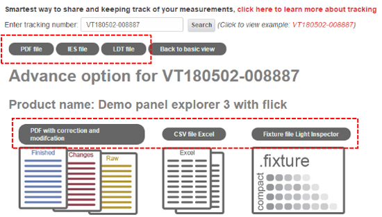 只需要在測試的時候,保持電腦聯網,軟件中勾選追蹤功能,測試完成后就會生成一個追蹤編號(下圖搜索框中),通過編號即可到Viso官網查詢原始數據和修正數據。點擊圖中紅色虛線框中的深灰色按鈕,即可下載相應的文件。