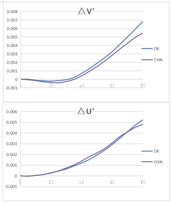 由于不同角度的光度數據量較大,直接看數據也不夠直觀,因此作如下圖,取0-80°的CIE1976色坐標(u’和v’)的變化作圖(與0°的對比),其中藍色曲線DK為丹麥Viso數據,紫色CHN為國內客戶在華南某計量院測試數據。由下圖可以看出,Viso與傳統分布光度計測試的趨勢完全吻合。另外,COB從中心位置到邊緣的,越到邊緣的變化應該是越大的,因此色坐標的變化曲線也是應該是越陡(斜率越大),從圖中可以看出Viso的數據更加的符合這種客觀變化。