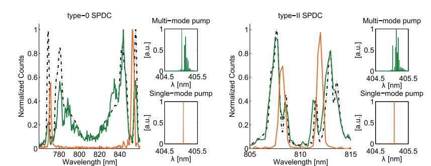 如圖所示,橙色曲線為利用405nm單模(窄線寬)激光泵浦的光子對(duì)輻射光譜曲線,綠色為利用405nm多模(寬線寬)激光泵浦后的光子對(duì)輻射光譜曲線,很明顯,0型PPKTP采用多模激光激發(fā)后光子輻射譜過(guò)寬,為了勉強(qiáng)可用還需要額外附加帶通濾光片做濾波;而II型PPKTP在采用多模激光激發(fā)后線寬漂移和展寬都不大,一般可以直接應(yīng)用,也就是說(shuō)II型更能適合多模激光泵浦源。