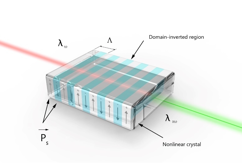 PPKTP其中的PP意思是周期性極化,具體來(lái)說(shuō)是通過(guò)施加高壓電場(chǎng)使帶電磁性的晶體特定區(qū)域內(nèi)的極性產(chǎn)生永久性的翻轉(zhuǎn),當(dāng)通過(guò)一定的工藝實(shí)現(xiàn)了穩(wěn)定性的周期翻轉(zhuǎn)后,就在晶體內(nèi)引入了非線性極化率的周期性的階躍變化,從而可以實(shí)現(xiàn)準(zhǔn)相位匹配(QPM : Quasi Phase Matching)。根據(jù)準(zhǔn)相位匹配理論,通過(guò)對(duì)晶體的非線性極化率的周期性調(diào)制來(lái)補(bǔ)償非線性頻率變換過(guò)程中因色散引起的基波和諧波之間的波矢失配,可以獲得非線性光學(xué)效應(yīng)的有效增強(qiáng)。