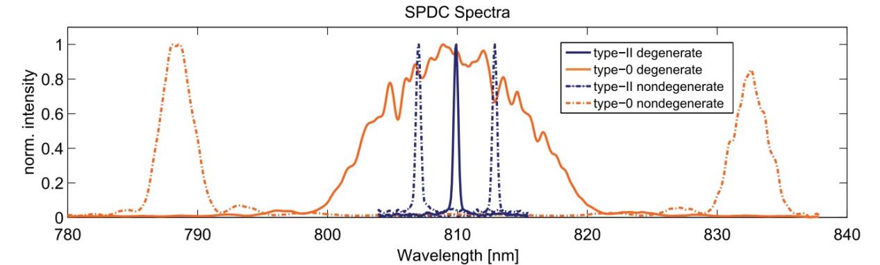 對(duì)于II型PPKTP的自發(fā)參量下轉(zhuǎn)換輻射過(guò)程,信號(hào)光和閑散光的偏振輸出是正交的,其群速度在波長(zhǎng)簡(jiǎn)并度上已經(jīng)有明顯的差異,導(dǎo)致了相對(duì)較小的光譜帶寬,如果某應(yīng)用需要相對(duì)窄的輸出光譜帶寬則可以考慮。
