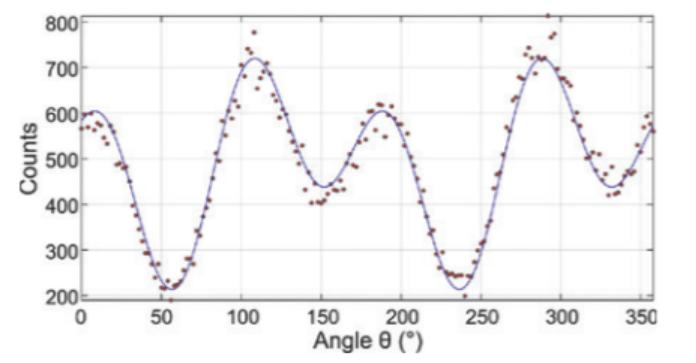 圖2:斯托克斯矢量的測量:對于特定波長(例如,在786nm處),強度相對于旋轉四分之一波片的角度繪制。藍色曲線是通過將方程(1)擬合到數據而獲得的。