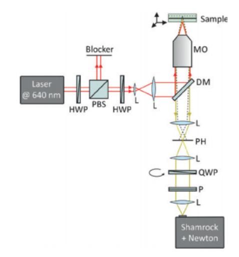 基于640 nm波長的連續波激光器作為光源的共聚焦顯微拉曼光譜儀(見圖1)。通過在偏振分束器(PBS)前面旋轉半波片(HWP)來控制激光功率。光束通過另一個HWP調整其線偏振角,并通過由兩個透鏡組成的望遠鏡裝置進行擴展。然后,激光束穿過具有650nm濾光器邊緣的二向色鏡(DM),進入放大100倍的顯微鏡物鏡(MO),用該物鏡將激光束聚焦到樣品上。將樣品固定在掃描定位臺上。拉曼散射光譜是紅移到660nm和830nm之間的波長范圍,在向后的方向上穿過MO,并由二向色鏡透射。共聚焦裝置由兩個透鏡(L)和一個針孔(PH)組成,用于阻擋在到達檢測器的路徑上并非來自焦體積的光。剩余的光透射通過四分之一波片(QWP)和偏振器(P),這樣就可以測量含偏振性的樣品,然后聚焦在EMCCD(Andor Newton DU970P-BVF)上。