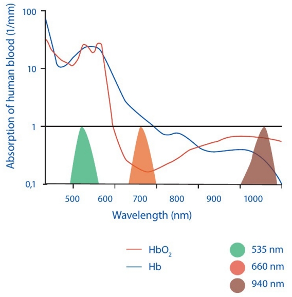血液對光的吸收取決于光的波長(圖2)。綠光被人體血液有效吸收,因此通常用于測量心率。吸收還取決于血液中的血紅蛋白(Hb)分子是否與氧結合。這種效應在紅光和近紅外(NIR)光下最強,這就是為什么 這些波長通常用于PPG測量SpO2。在這個 測量中,光的吸收在兩個不同的波長,通 常約660和940nm波長,是用PD進行測量。