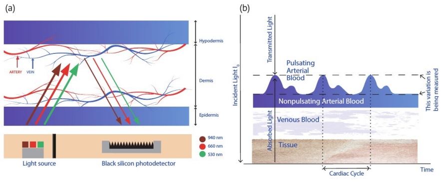 (b)部分入射光被組織、靜脈血和動脈血吸收,其余部分通過身體透射或從身體反射。吸收光的量是周期性變化的,因為動脈血容量隨心臟周期的階段而變化。HR可以得以確定通過測量這種變化。