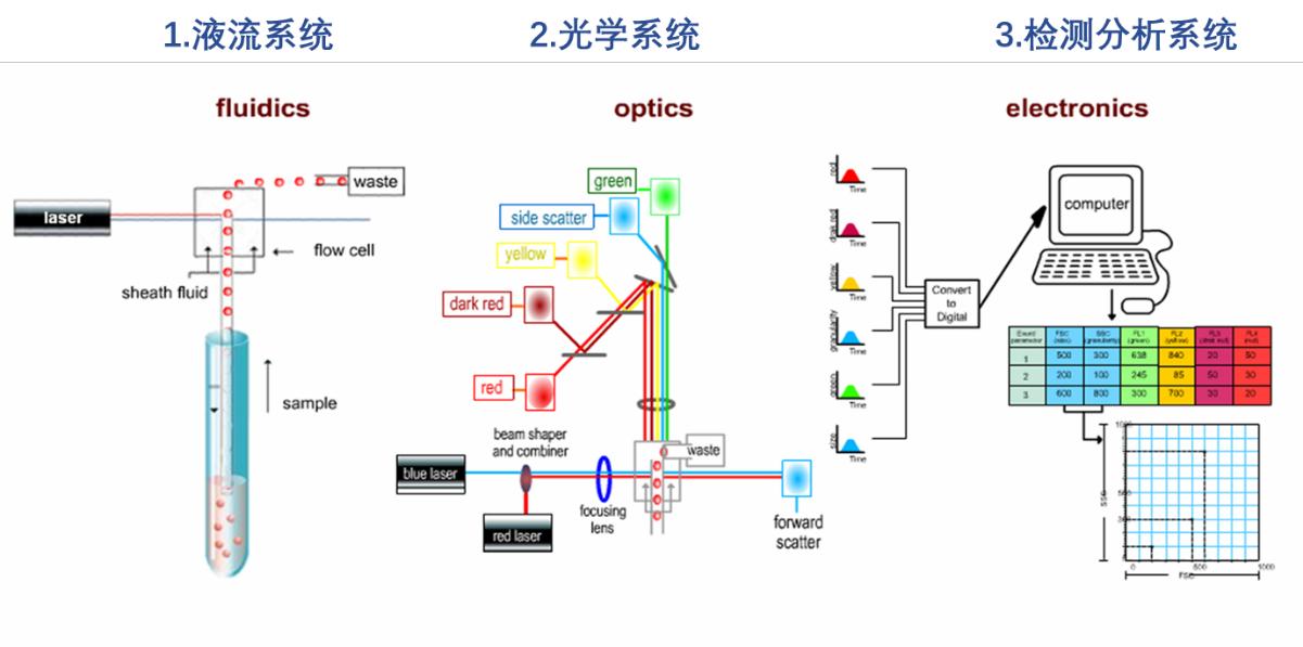 流式細胞儀是測量染色細胞標記物熒光強度的細胞分析儀,是在單個細胞分析和分選基礎上發展起來的對細胞的物理或化學性質(如大小、內部結構、DNA、RNA、蛋白質、抗原等)進行快速測量并可分類收集的高技術儀器。