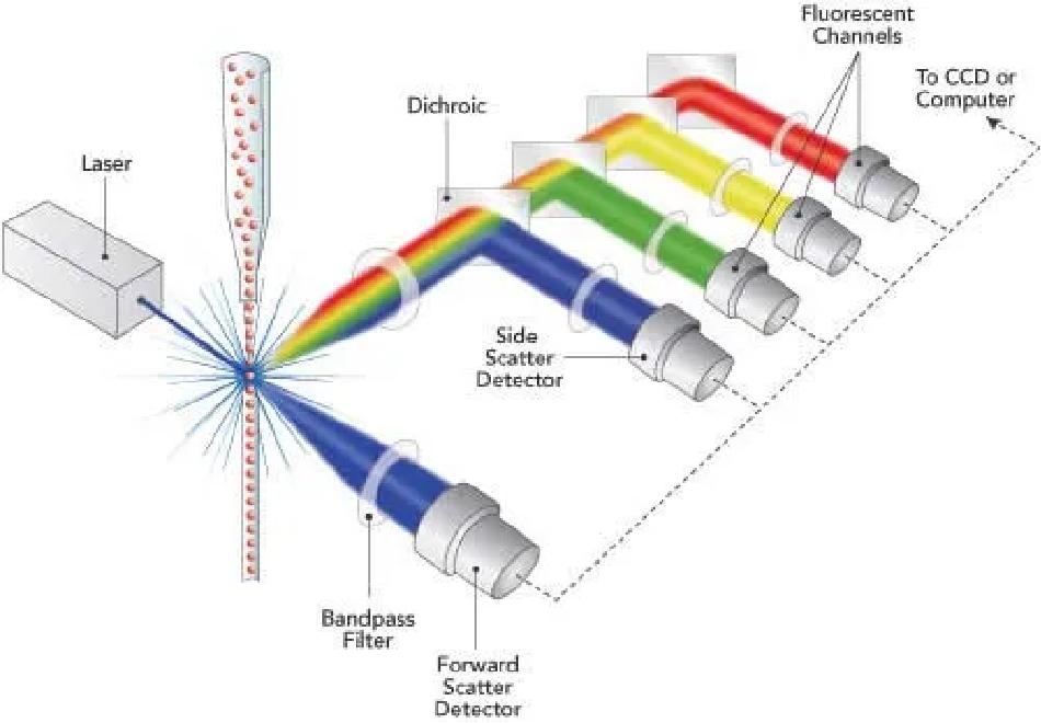經特異熒光染色的細胞需要合適的光源照射激發才能發出熒光供收集檢測。常用的光源有弧光燈和激光;激光器又以氬離子激光器為普遍,也有配和氪離子激光器或染料激光器。