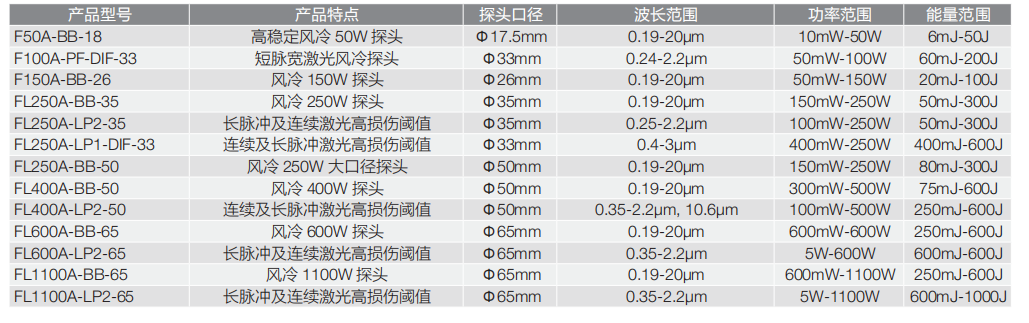 • 多種吸收膜層適合短脈沖、長脈沖、高能量和高功率密度的不同激光測量