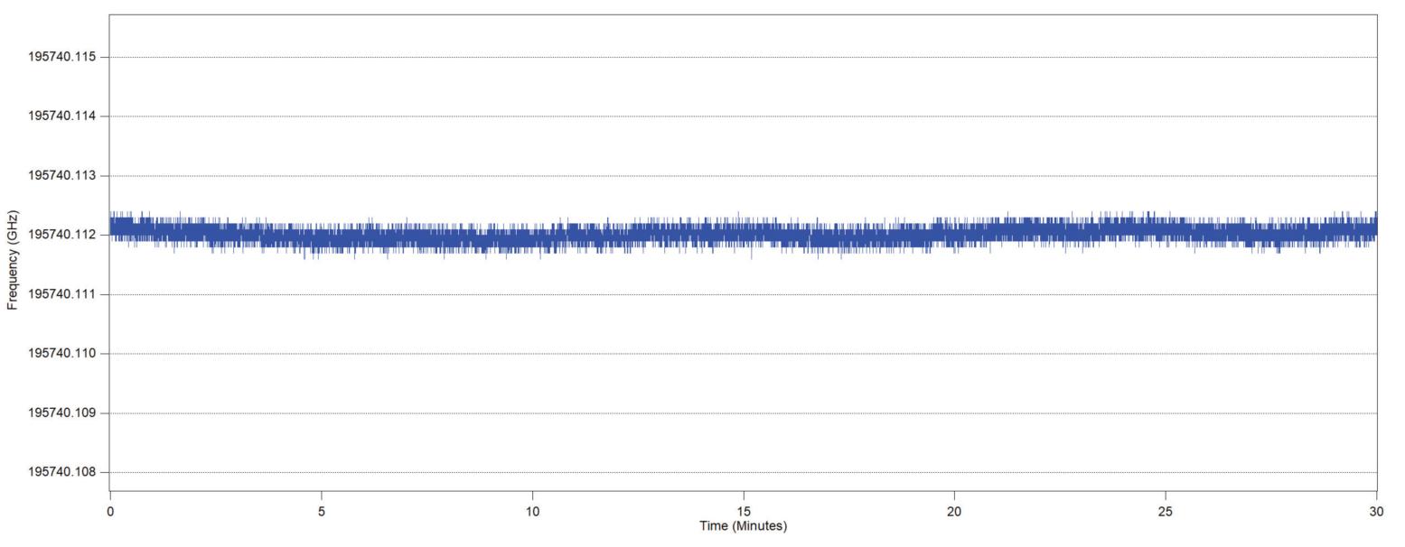 下圖是872A-NIR監(jiān)測1532nm乙炔鎖頻激光器在30分鐘內(nèi)的中心波長漂移測量結(jié)果。