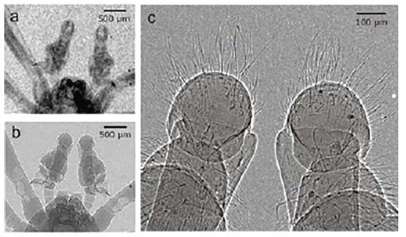 蜘蛛腿, 5μm 脈沖液體射流源, 50 kv, 0.8 mA, 放大倍數(shù):左x1,右x4, 4K*4K 分辨率,9um 像素;