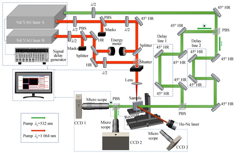 綠色光路部分是1064nm激光經(jīng)過倍頻形成532nm綠光作為探測光,之所以選用532nm波長是因為后續(xù)的CCD探測器其量子效率峰值大致在綠光波段。532nm探測光繼續(xù)經(jīng)過一個偏振分束器,分成兩路正交的偏振光,這兩路正交的偏振探測光是和左下方CCD1+microscope與CCD2+microscope聯(lián)用的,目的是架構(gòu)一套自組的DIC微分干涉差顯微鏡,拍攝被測器件縱向損傷圖樣。