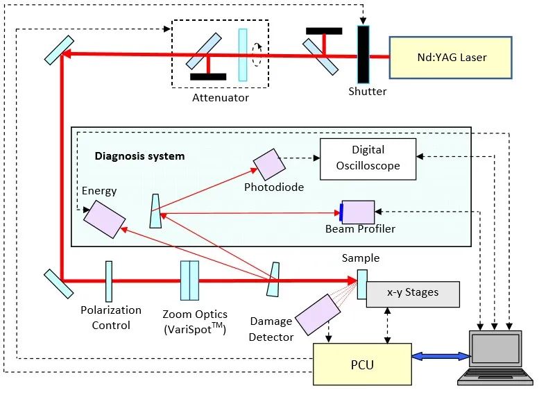 首先分析一個自組LIDT激光誘導損傷閾值檢測系統(tǒng)