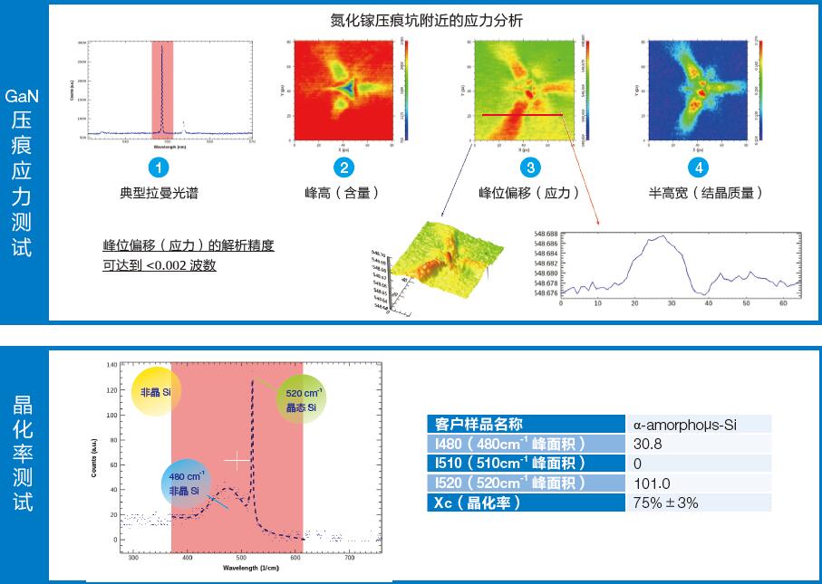 可直觀給出應力屬性(拉力/ 張力),針對特種樣品,可直接計算應力大小,應力均勻性分析 (需額外配置電動位移臺), 應力解析精度0.002cm-1 |