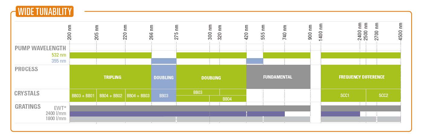 常用染料可提供420 ~ 950nm 的可調諧范圍。通過倍頻、三倍頻、和頻方式可獲得200nm ~ 420nm 連續可調諧的輸出;通過差頻可擴展至4500nm 紅外輸出。
