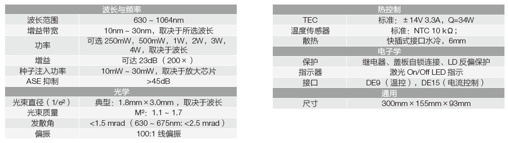 錐形放大器采用一種特殊的半導體激光芯片(TaperedAmplifier Chip,TA Chip)對輸入種子激光進行放大,*大程度的保留種子激光的光譜與空間模式特征,同時提供更高的光功率輸出。Moglabs 提供集成種子光源的MSA 系列以及外置種子光源的MOA 系列,覆蓋650 ~ 1080nm 波長,具備非常低的頻漂和被動展寬。