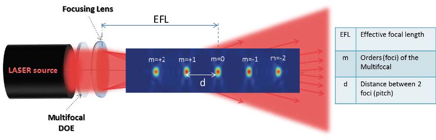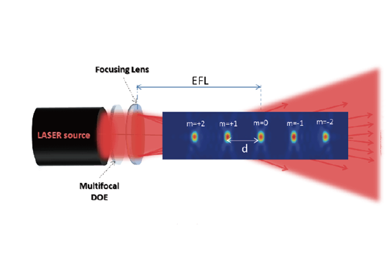 一束準直光束(單?;蚨嗄#┤肷涞蕉嘟裹c整形器上,沿著光軸方向,距離多焦點整形器不同的位置會產生一系列焦點光斑。
