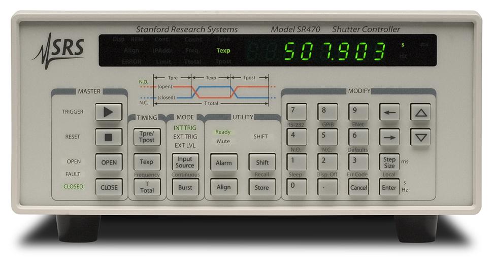 SR470激光快門控制器可以給快門頭發(fā)出信號,達(dá)到控制快門開合的目的。曝光時間可以靈活設(shè)置,在0.1ms 的分辨率下,時間設(shè)置范圍為:4ms 到10000s ;可以設(shè)置先曝光和后曝光的時間;8 位數(shù)LED 顯示器顯示目前的參數(shù)為秒或是赫茲,時間可以精確到100ppm。SR470激光快門控制器具有多種觸發(fā)方式:內(nèi)觸發(fā)、外觸發(fā)及面板操作。SR470具有GPIB、RS232及以太網(wǎng)等接口,支持遠(yuǎn)程控制。所有的設(shè)備功能都可以通過任何一個接口進(jìn)行控制和讀取。SR470 快門控制系統(tǒng)具有自動檢測功能,若快門發(fā)生故障,可以通過顯示屏看到故障提示或聽到故障報(bào)警,能幫助您及時發(fā)現(xiàn)并排除故障,提高了實(shí)驗(yàn)的可靠性。