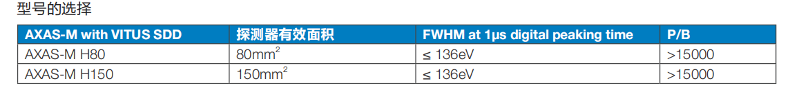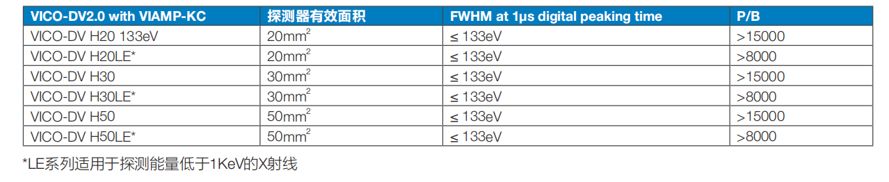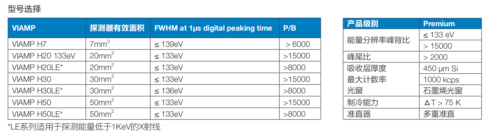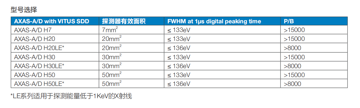 按照產品的功能分類,SDD的探測器分為 VIAMP,VICO-DV, AXAS-A/D,AXAS-M、五個系列。探測器有效面積從7mm2-150mm2可選