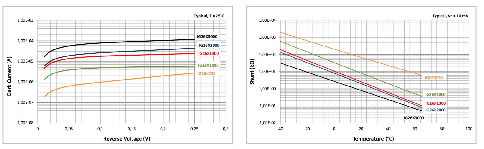 圖2, 暗電流Vs 偏置電壓 圖3, 分流電阻 Vs 溫度