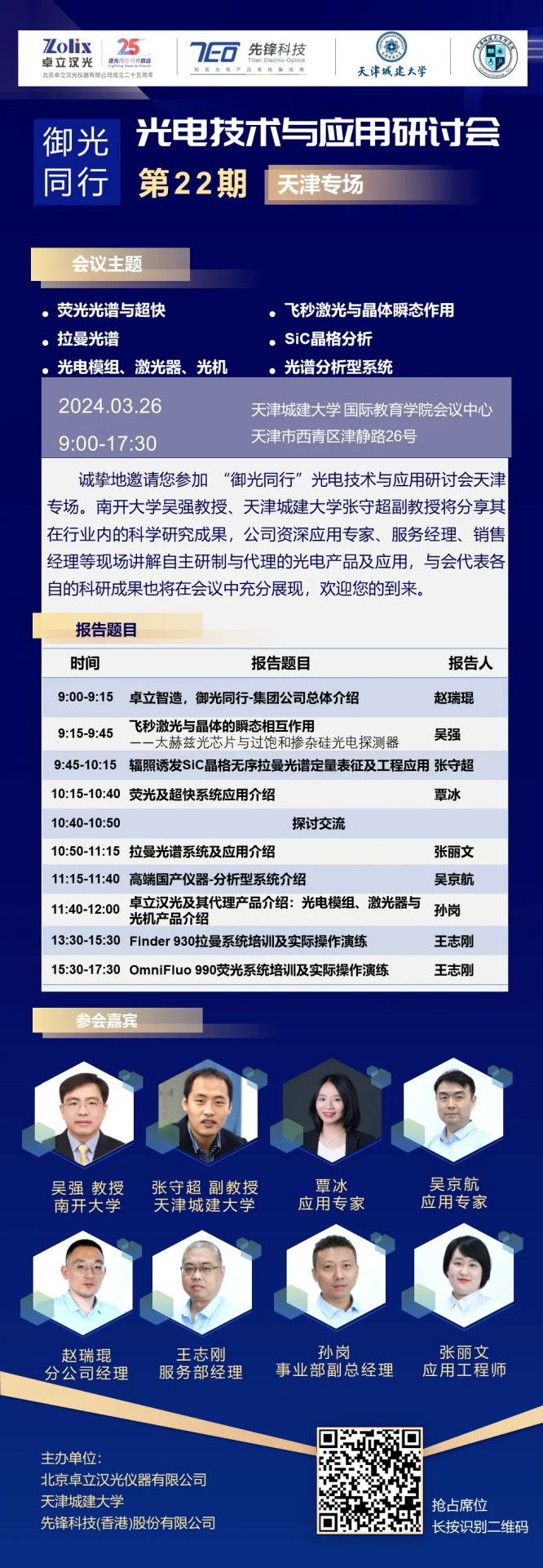 截至目前,卓立漢光已順利舉辦了21期線下/線上研討會(huì),觀眾熱情高漲,為了滿足大家對會(huì)議的期待,第22期“御光同行”光電技術(shù)與應(yīng)用研討會(huì)天津?qū)鰧⒂?024年3月26日09:00-17:30在天津城建大學(xué)國際教育學(xué)院會(huì)議中心召開。會(huì)議現(xiàn)場,南開大學(xué)吳強(qiáng)教授、天津城建大學(xué)張守超副教授將分享其在行業(yè)內(nèi)的科學(xué)研究成果,公司應(yīng)用專家、服務(wù)經(jīng)理、銷售經(jīng)理等現(xiàn)場講解自主研制與代理的光電產(chǎn)品及應(yīng)用,與會(huì)代表各自的科研成果也將在會(huì)議中充分展現(xiàn)