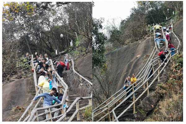 丹霞山*精華的部分匯集在這里,從山腳到山頂,一步一景,人文風(fēng)貌與自然觀景相結(jié)合。下著雨,讓原本陡峭的山路更添濕滑,我們手拉手好似拴在一起,一點(diǎn)點(diǎn)往下挪,這就是團(tuán)隊(duì)的力量。
