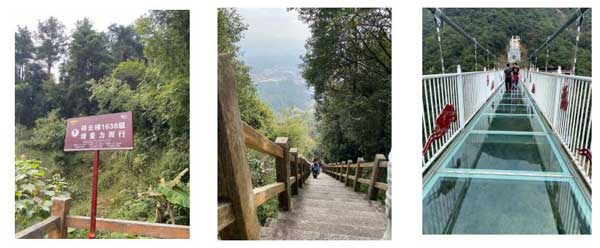 第一天的興奮還未散去,就開始了我們第二天的挑戰(zhàn)之旅。這一天我們挑戰(zhàn)了1638級的祥云梯,來到祥云梯腳下,只見告示牌上寫著“量力而行”四個(gè)字,極目望去,高不見頂,內(nèi)心一陣掙扎,山不在于高,而因?yàn)槎福覀儽舜讼嗤ハ啻驓猓ど线@幾乎80°的階梯,然而挑戰(zhàn)并沒有結(jié)束,等待我們的還有一條全透明高空景觀玻璃橋,該橋全長316米,橋面通體透明,可以非常清楚地看到谷底的景色,如果在谷底仰望,玻璃上的人影也清晰可見。最終,一個(gè)都沒有少,我們登上了祥云梯,也走向更加驚險(xiǎn)刺激的玻璃橋。