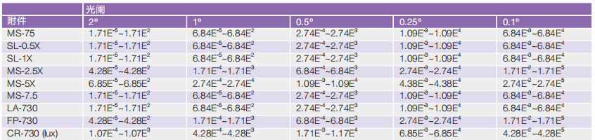 備注:亮度值均是在 2°光闌,PR-730/740:8nm 光譜寬度 , PR-735/745: 14nm 光譜寬度條件下計算得出。