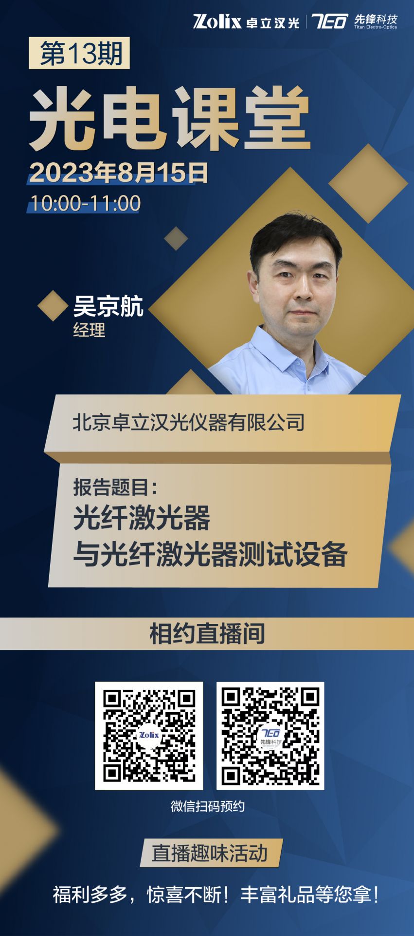 8月15日上午10:00—11:00北京卓立漢光儀器有限公司 業務發展部—吳京航經理將為我們帶來光纖激光器與光纖激光器測試設備的介紹,分享最近十年蓬勃發展的光纖激光器的技術特點,以及我司代理光纖激光器與光纖激光器測試設備。直播期間更有豐富好禮相送,歡迎屆時參加!